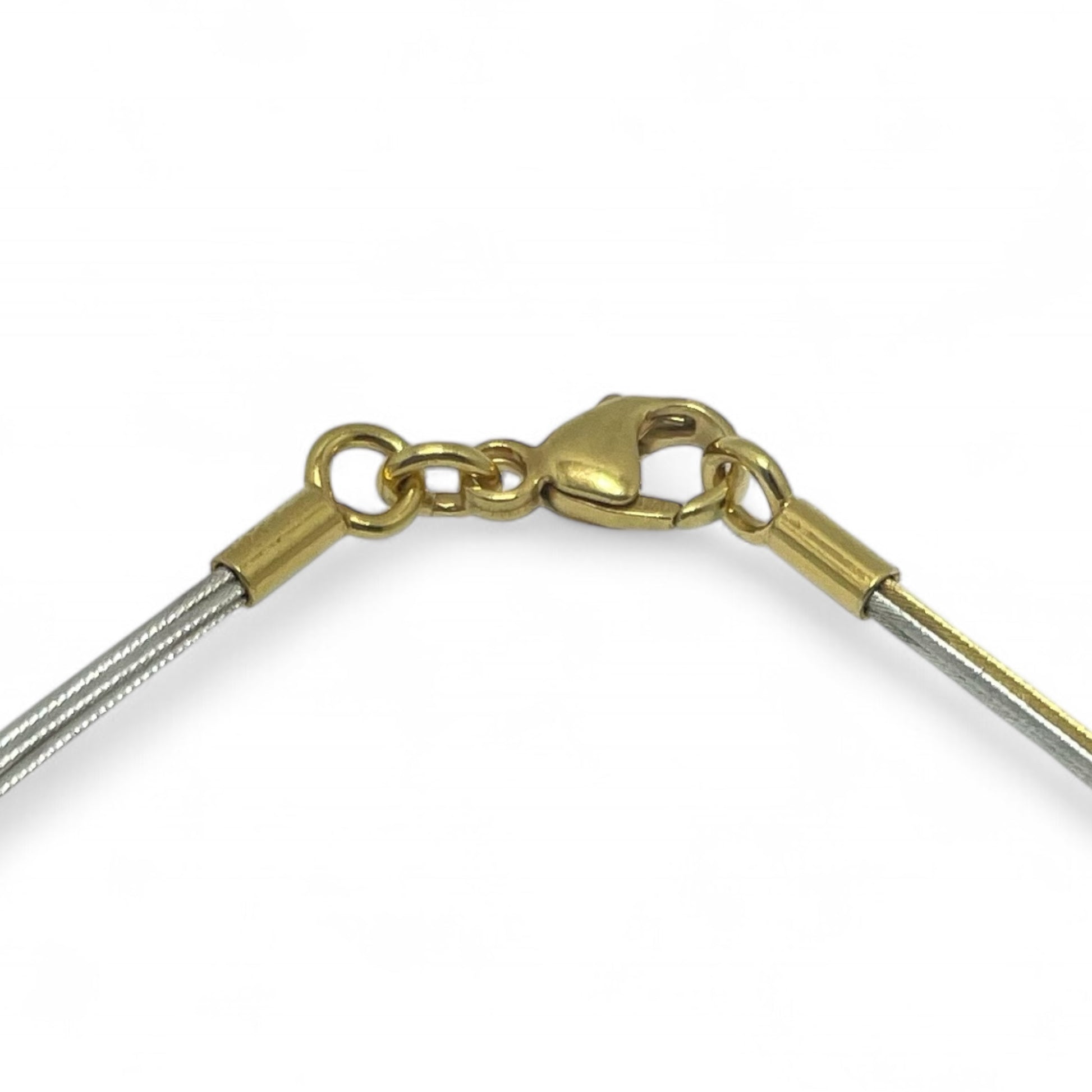 Handcrafted necklace. Pendant part is sterling silver. Necklet is nylon coated, 5-string, gold-silver coloured, steel wire. The closing mechanism is a lobster clasp.